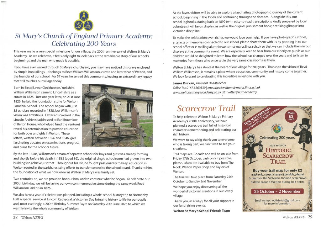 Welton St Mary’s has stood at the heart of our village for 200 years. Thanks to the vision of Rev. William Williamson, it remains a place where education, community, and history come together. We look forward to celebrating this remarkable milestone with you all – past, present, and future.